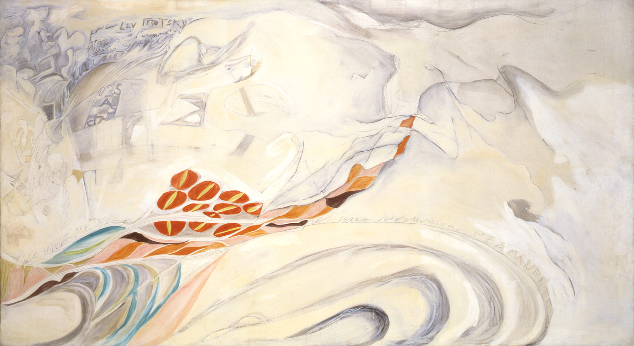Il percorso espositivo a Ca’ Pesaro, articolato in otto sale, riunisce circa sessanta opere e si concentra sul periodo più intenso della produzione di Novelli (1957-1968). Dalle prove informali degli anni de L’Esperienza Moderna – rivista fondata con Achille Perilli – alle opere in cui fonde linguaggio visivo e verbale, fino ai lavori dal forte significato etico e politico esposti alla Biennale di Venezia del 1968. Accanto ai capolavori più noti, sono presenti opere considerate disperse e mai esposte, accompagnate da documenti che testimoniano la vivace vita intellettuale di Novelli, i suoi legami con il mondo letterario e le amicizie con artisti e scrittori.